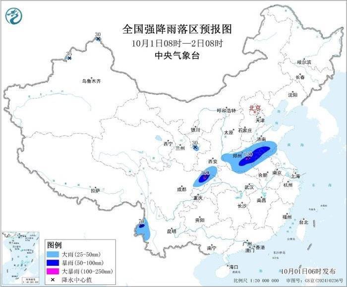 r央视网消息:中央气象台10月1日06时继续发布暴雨蓝色预警,预计,10月1日08时至2日08时,河南大部、山东南部、安徽北部、江苏北部、陕西南部、四川东北部、重庆北部、云南西部等地部分地区有大到暴雨,局部地区有大暴雨(100~160毫米)。上述部分地区伴有短时强降水(最大小时降雨量30~50毫米,局地可超过60毫米),局地有雷暴大风等强对流天气。